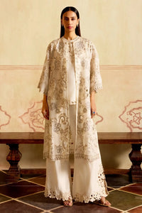 Featuring an ivory and silver silk organza jacket embellished with metallic applique, intricate cutwork, and delicate beadwork.