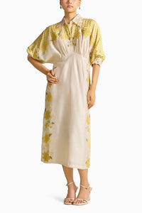 Featuring ivory and yellow chanderi checkered applique, threadwork kimono dress .