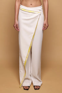 Featuring the Ivory Arc Trousers, draped ivory pieces crafted from a soft blended viscose. They offer a high-waisted fit with asymmetrical wrap detail and are accented with a 3D Monet detail for striking contrast. A concealed waist fastening ensures a clean finish.