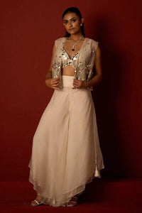Make a striking entrance with this Ivory Asymmetrical Jacket paired with elegant Organza Flared Pants. The jacket showcases intricate zari mirrorwork and delicate jaali detailing, offering a contemporary twist on classic craftsmanship. Complemented by lightweight, ethereal organza pants featuring a unique asymmetrical flare, this ensemble blends modern design with timeless elegance—perfect for sophisticated occasions.