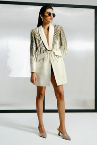 Featuring Ivory Blazer Dress with Crystal-Sequin Detailing by CITARA’s Bridesmaid Collection. Crafted in soft crepe, this relaxed silhouette shines with crystals, sequins, and bugle beads, blending sophistication with a touch of sparkle.