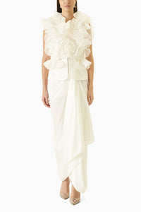 Redefine your charming look with this Ivory Bloom Top With Skirt Co-ord Set. A classic white organza ruffle jacket and skirt is cut in satin fabric, it assures a soft and soothing touch against the skin. Style this set with a pair of high heels & statement earrings.