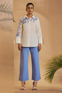 A perfect fusion of elegance and comfort, this co-ord set features a chic spread-collar shirt with a curved high-low hemline, intricate embroidery on one sleeve and front panel, and broad cuffed sleeves with a slit. Paired with straight pants featuring embroidered detailing and a side slit.