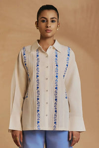 Pintuck drop-shoulder shirt features symmetrical embroidery on the front panels, adding a touch of artisanal charm. The long pleated sleeves with broad cuffs and the front button closure ensures a classic finish.