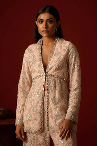 Make a graceful statement with this Ivory Blush Peplum Blazer, featuring hand embroidery, mirrorwork, and delicate beadwork on sheer tulle sleeves. Its tailored silhouette and intricate embellishments blend elegance with modern sophistication—perfect for elevating any look.
