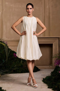 This ivory Chanderi bubble hem gathered dress exudes effortless elegance with its soft, flowing silhouette. The gathered design creates a flattering, structured look while the bubble hem adds a playful, contemporary twist. Crafted from lightweight Chanderi fabric, the dress offers comfort and fluidity, making it perfect for both casual and semi-formal occasions.