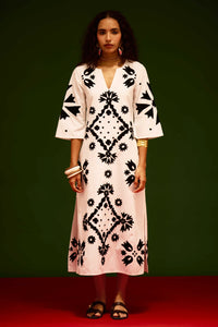 Featuring an ivory cotton poplin maxi dress with striking black sitara thread embroidery, this relaxed-fit design offers a sophisticated contrast and comfort for effortless elegance.