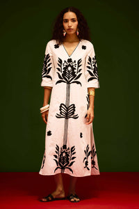 Featuring an ivory cotton poplin maxi dress with bold black tulip thread embroidery, this relaxed-fit piece blends classic charm with modern contrast, offering breathable comfort and effortless elegance.
