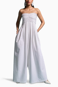 Ivory off-shoulder relaxed fit jumpsuit with intricate crochet work on the bustier. Pleats sewn below the crochet panel open out toward the wide-legged hem. Smocked and elasticated cutout panels in the back. Side pockets. Comes with detachable adjustable straps. Crafted from crushed cotton fabric for a textured finish.