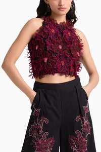 Featuring a black chanderi daisy 3D appliqué  top by  Chandrima's Florens collection. The lightweight fabric drapes gracefully, while the relaxed silhouette offers comfort and ease of movement.