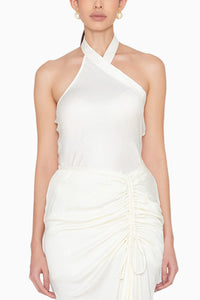 Featuring Cyea Top by Contemponari. Crafted from Modal Satin, this ivory top features a flattering slash neck for a chic and modern look. The unique neckline where the closure extends from the back and elegantly trails to the front, the luxurious feel of the fabric and the vibrant shade there are reasons enough for you to fall in love with this top!