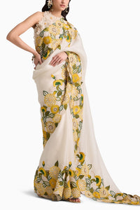 The Ivory Daisy 3D Applique Sari with Top embodies timeless elegance and intricate craftsmanship. Crafted from luxurious ivory fabric, the sari features delicate 3D applique daisies that cascade along the edges, creating a stunning, dimensional effect. The meticulous detailing adds a touch of whimsy and sophistication, making it perfect for special occasions such as weddings or formal gatherings.
