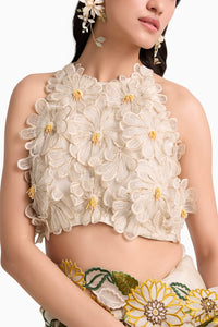 Featuring an Ivory Daisy 3D appliqué top with beadwork detail by Chandrima's Florens collection. This top is made from Chanderi fabric, known for its lightweight and sheer texture, which lends it an ethereal quality.