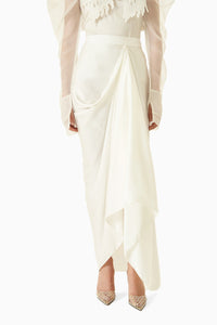 Featuring a Ivory Draped Style Skirt by Renasci. The front drape gives a flattering look to the body and can be worn with a shirt or your favorite top. The satin sheen makes it a great option for a night out.