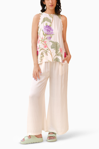 The Ivory Dream Back Knot Co-ord Set is a flawless choice for your simple summer outfits. This set features a scalloped printed back knot top, paired with solid ivory pants. This set combines practicality with a touch of whimsy, perfect for any relaxed or casual setting.