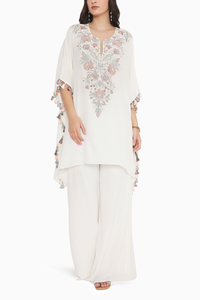 Featuring an Ivory embroidered crepe kaftan with crepe palazzo. Embrace comfort and modern flair effortlessly!