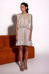 Crafted from glass organza, this embroidered dress features intricate embroidery all over, complemented by soft pleats and a double-bubble hem. The airy fabric lends movement and lightness, creating a silhouette that feels both playful and refined.