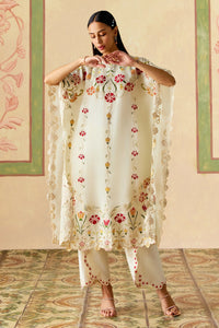 Featuring an ivory silk organza kaftan with floral applique, beadwork, and intricate cutwork, paired with ivory chanderi tulip pants embellished with floral threadwork and cutwork detailing.