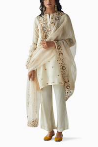 Featuring our exquisite ivory zardozi embroidered anti-fit kurta set, crafted for those who appreciate timeless elegance. Paired with crepe flared pants, this ensemble exudes sophistication and grace. Complete your look with the four-sided embroidered dupatta, adding a touch of opulence to any occasion. Perfect for those seeking refined style with a hint of traditional charm.