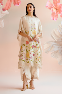 Introducing our stunning Ivory silk organza kaftan, beautifully embellished with floral appliqué, beadwork, and intricate cutwork. This elegant piece drapes gracefully, creating a flattering silhouette perfect for special occasions. Paired with ivory Chanderi cutwork tulip pants, this ensemble exudes sophistication and style. The tulip pants enhance comfort while adding a modern touch to the traditional look.