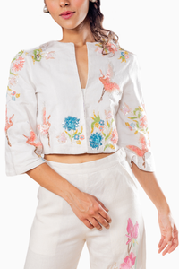 Featuring the Ivory Floral Bird Jacket by Kukoon Label. Crafted from ivory white linen, it offers a comfortable fit and showcases intricate hand embroidery depicting floral and bird motifs. This jacket is a single component, perfect for adding artisanal charm to your ensemble.