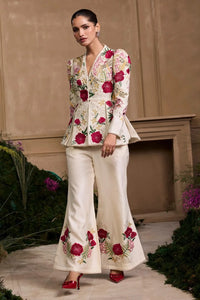 This elegant ensemble combines an ivory Chanderi pleated peplum jacket with floral appliqué, threadwork, and beadwork, paired with ivory Chanderi floral appliqué and threadwork bell-bottom pants. The jacket features intricate floral embroidery with delicate bead detailing, creating a refined and textured look. The pleated peplum silhouette adds structure and sophistication. Paired with the bell-bottom pants, which are adorned with matching floral appliqué and threadwork, this ensemble creates a graceful and flattering flow.