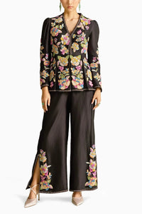 Featuring black chanderi cordwork and beadwork pleated peplum jacket paired with black chanderi cordwork and beadwork flared pants with side slit detail.