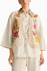 Featuring ivory chanderi floral applique and cutwork mesh layered shirt.