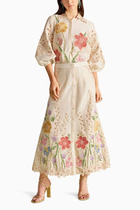 Featuring ivory chanderi floral mosaic threadwork, beadwork and cutwork shirt paired with ivory chanderi floral mosaic threadwork, beadwork and cutwork button-down skirt.