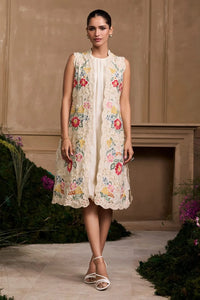 This ivory Chanderi long jacket is a stunning combination of floral panel threadwork, intricate beadwork, and delicate cutwork. The soft ivory fabric serves as a sophisticated canvas, highlighting the detailed floral embroidery and shimmering beads that add depth and texture. The cutwork design brings a modern edge to the piece, making it a perfect statement piece for festive occasions or formal gatherings.