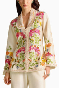 Ivory Floral Threadwork And Beadwork Flared Jacket
