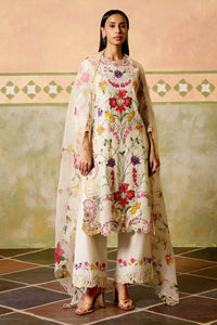 Featuring an ivory chanderi kurta embellished with floral threadwork, cutwork, and beadwork, paired with ivory chanderi pants adorned with intricate threadwork and cutwork, and completed with an ivory silk organza dupatta showcasing delicate floral prints and beadwork.
