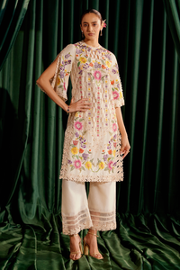 Introducing our exquisite Ivory Chanderi kurta, adorned with beautiful floral threadwork, beadwork, and intricate cutwork. The kurta features stylish split sleeves that add a contemporary touch, while the cutwork pants with organza details elevate the overall elegance of the ensemble. This set is perfect for festive occasions or formal gatherings, offering a sophisticated yet comfortable fit.