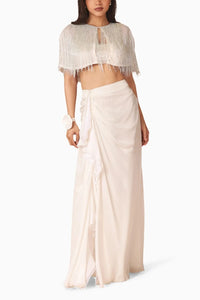 Introducing Shriya Som's capelet from the Chrysalis Collection, adorned with vibrant fringes, gitch embroidery, and shimmering crystals. Paired with a chiffon skirt featuring a graceful drape detail, a high slit, and intricate beaded gitch embroidery at the waist. Complemented by a ruched bandeau, this ensemble exudes effortless elegance and modern charm.