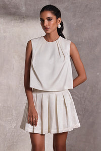 This sleeveless top is crafted in ivory Gajji silk and finished with delicate pleats at the neckline. The soft detailing adds dimension to its clean silhouette, making it a versatile essential that transitions seamlessly from nine to wine.