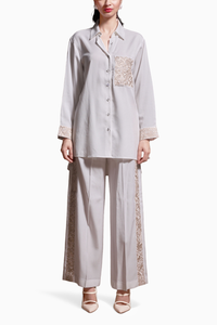 Featuring a relaxed-fit high-low shirt with contrast gara stitch embroidery on the front patch pocket and sleeve cuffs, this shirt includes a shirt collar with a button-down placket, a box pleat at the back, and side seam slits for added style. It is paired with ivory relaxed-fit pants featuring contrast gara stitch embroidery panels along the side seams. The pants have a button and zip closure, an elasticated waistband for comfort, and practical side pockets.