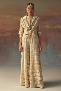 Featuring a stylish gilet with a belt, adorned with mirrorwork and beadwork, this piece adds a touch of sparkle and structure to any outfit. Perfect for layering with a chic, contemporary edge.