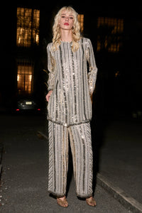 Longline top in gold linear sequin and thread embroidery that shift with light. Geometric layout in soft champagne gold tones on an ivory base, give the garment a luxe, luminous finish. Full sleeves in a straight cut, relaxed fit. Round neck with pearl button and loop closure at the back. Slits in the sides. Garment is fully lined. Paired with matching wide-legged flared pant. Concealed side zip with hook/eye closure. Garment is fully lined.