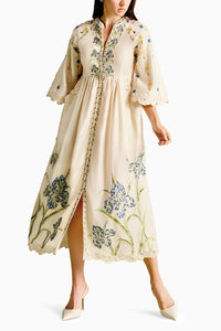 Featuring ivory chanderi iris mosaic threadwork, beadwork and cutwork midi dress.