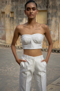 Tone on tone ivory jacquard. Structured bralette with detachable adjustable straps. Removable pad pockets. Zipper in the side.