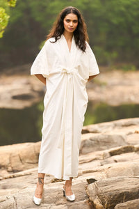 Breezy and elegant, this ivory kaftan dress features a V-neckline, fluid drop shoulder sleeves, and a front tie-knot detail. Hand-applied pleats at the front and back create a flattering silhouette, gently tapering toward the hem for a graceful finish.