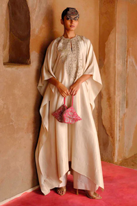 Featuring an Ivory embroidered kaftan paired with palazzo pants, tailored in Chinese Dupion.