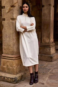 This soft knitted midi dress features a band collar and a flattering cocoon shape for a chic, relaxed fit. Crafted from textured jacquard in a cable knit pattern, it’s designed with a gold zip and round puller tabs on the front neck and sleeve cuffs, adding a touch of modern elegance to its cozy, effortless style.