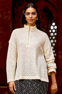 This soft flat-knitted popover top features a striking diamond geometric jacquard pattern. Designed with a sleek band collar, a gold zipper with a puller tab, and full sleeves, it offers both style and comfort. The relaxed fit makes it perfect for effortless, everyday wear with a touch of modern elegance.