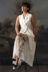 The Ivory Lace Set includes an exquisite overlap jacket adorned with lace applique embroidery and scallop detailing. The soft ivory hue and intricate craftsmanship create a graceful, feminine look, perfect for elevating any occasion with timeless elegance and charm.