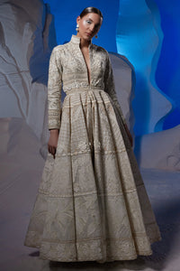 Crafted in a luxurious blend of linen silk and cotton, this ivory gown offers an elegant balance of structure and fluidity. Its graceful drape and refined finish make it perfect for festive celebrations and statement occasions.