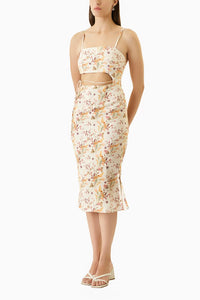 Designed Lyla midi dress in floral linen print, asymmetric side cutout with string tie. Defined by straight cut neckline with adjustable shoulder straps, elasticated back with hook closure.