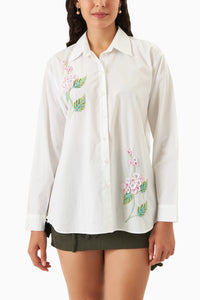 White cotton shirt decorated with embroidery in a floral pattern. Straight fit with detailed thread embroidery, offering a fresh and feminine style.