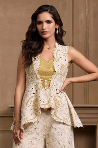 This elegant ivory Chanderi peplum jacket is a stunning example of craftsmanship, featuring metallic floral appliqué, intricate cutwork, and delicate beadwork. The soft ivory base is beautifully contrasted by the metallic florals, adding a modern touch of shimmer to the traditional fabric. The cutwork and bead detailing enhance the design, creating a refined, sophisticated look.