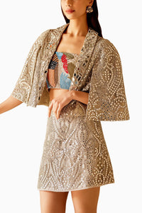 Featuring Mirriorwork crop jacket by Twenty Nine India's Bahar collection. This has Crop Silhouette with Cape Sleeves and embodies intricate Mirror and Bead detailing.